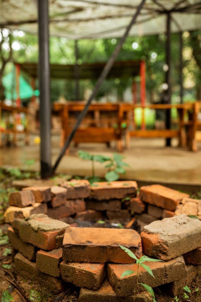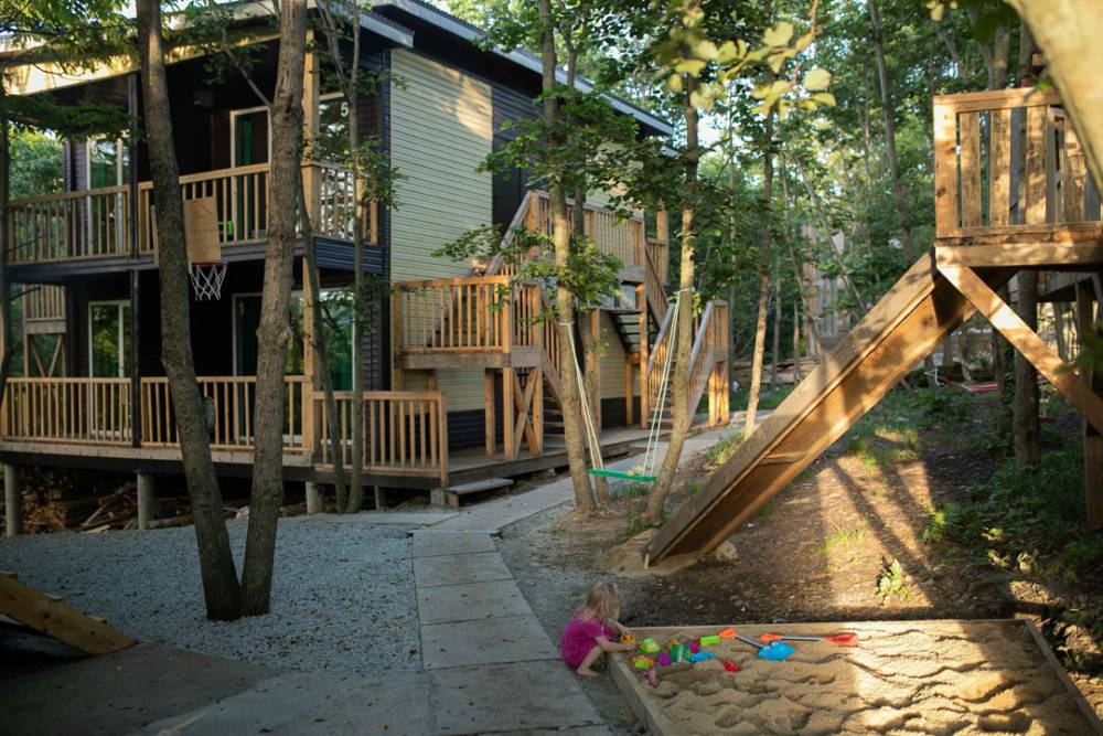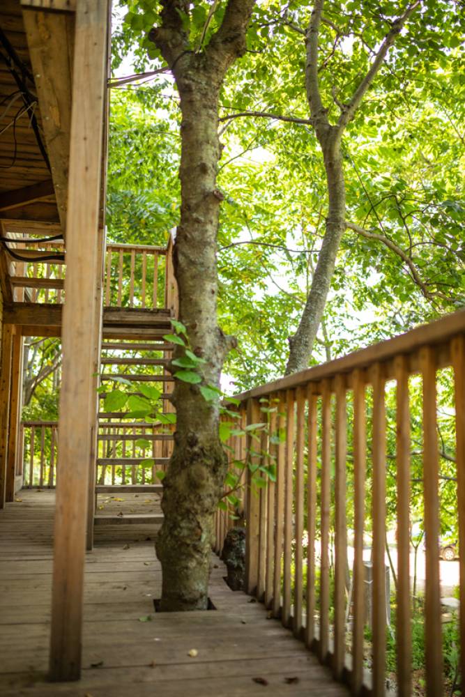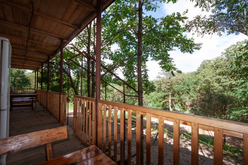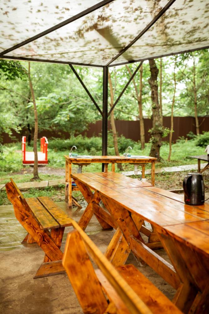 База отдыха "7 бухт" находится в лесной зоне. Деревья растут сквозь беседки.