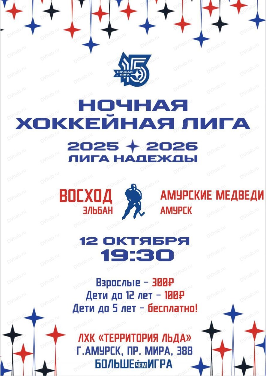 12 октября в 19:30 — официальное открытие с праздничной программой: выступления фигуристок, конкурсы для болельщиков и главное событие вечера — матч ХК "Восход"и ХК "Амурские медведи".