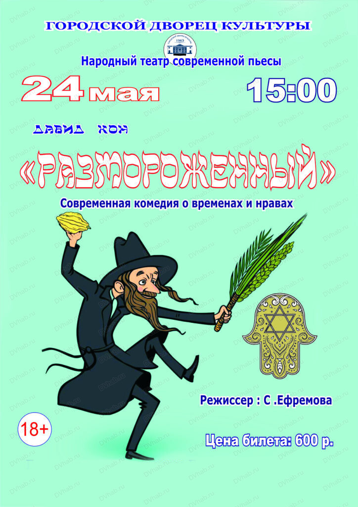 24 мая в 15.00 в городском Дворце культуры народный театр современной пьесы представит зрителю веселую, немного фантастическую историю по пьесе израильского драматурга Давида Кона «Размороженный» (режиссёр-Светлана Ефремова).