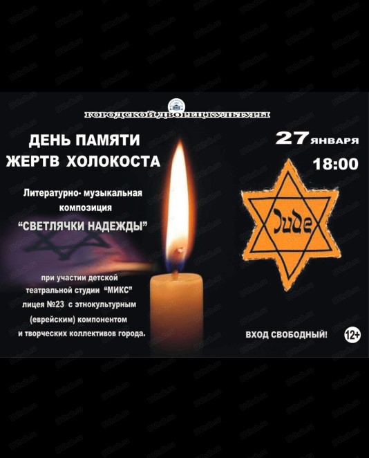 27 января в 18:00 в зале городского Дворца культуры состоится литературно-музыкальная композиция «Светлячки надежды», посвящённая Международному дню памяти жертв Холокоста.