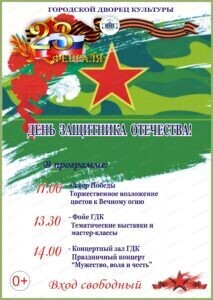 14:00 — Концертный зал городского Дворца культуры. Состоится праздничный концерт «Мужество, воля и честь» с участием творческих коллективов Дворца культуры и города.