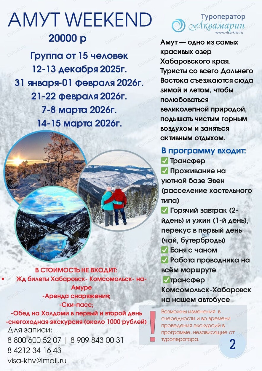 Туроператор "Аквамарин" приглашает детей и их родителей провести выходные в одном из самых красивых мест Хабаровского края - на озере Амут. Туристы со всего Дальнего Востока съезжаются сюда зимой и летом, чтобы полюбоваться великолепной природой, подышать чистым горным воздухом и заняться активным отдыхом.