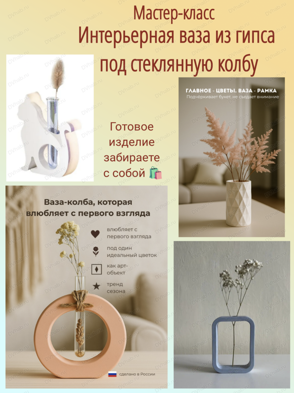Мастер-класс – это прекрасный способ провести время с семьей или друзьями, получить новые навыки и знания, а также создать уникальные подарки для близких. Вам будут предложены заготовки на выбор и широкий ассортимент силиконовых форм - ваза под стеклянную колбу в форме: сердца, овала, прямоугольника, кота; ваза для сухоцветов - цилиндрической формы с ромбами, морская тематика. Готовые гипсовые изделия станут отличным украшением интерьера, добавив в него тепло и уют.