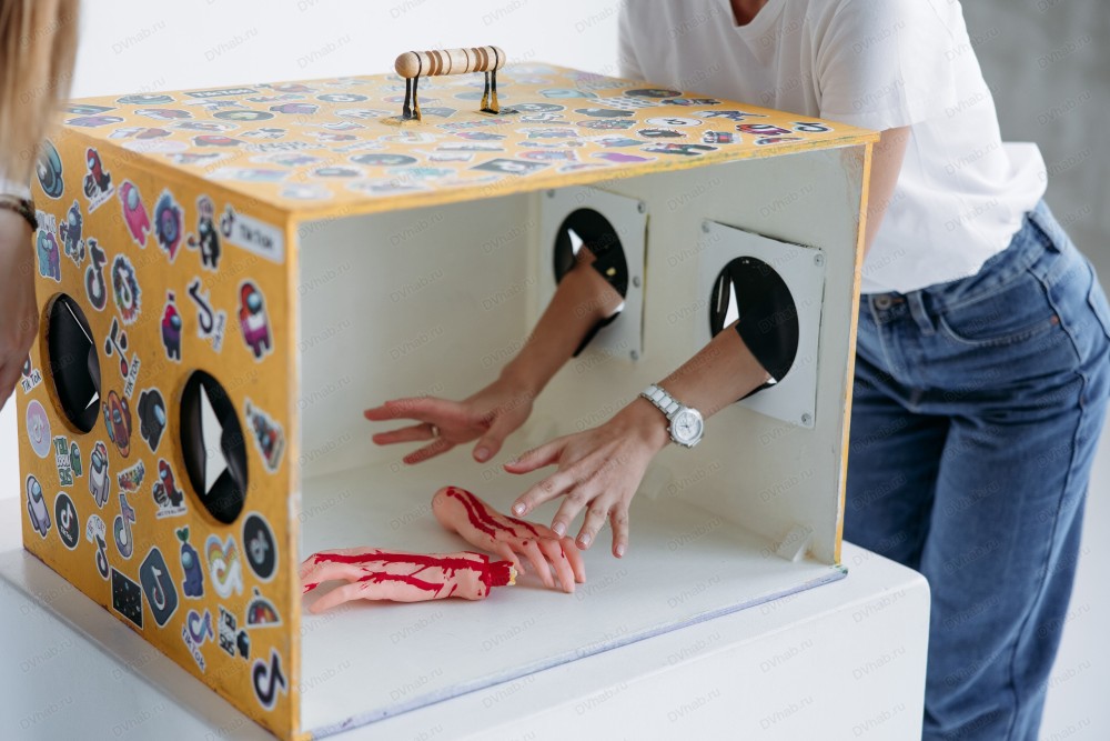 Ваша задача - угадать, что в коробке, используя руки и тактильное чувство. Там может быть все что угодно: обыкновенная расческа или ... нечто пресмыкающееся.