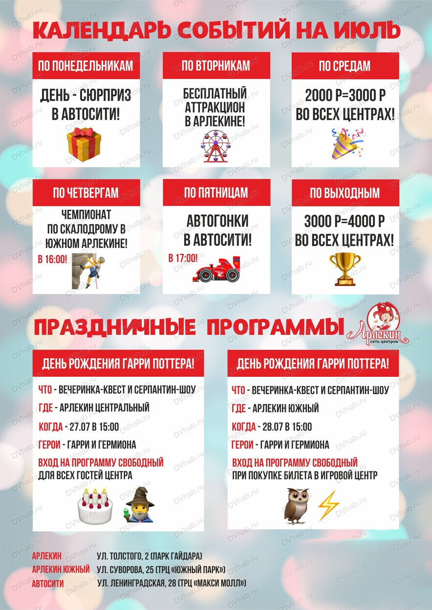 Второй месяц лета открываем ежедневным календарем мероприятий в "Арлекине". Один день недели - один вид активности. Участвует все детские центры сети Арлекин.