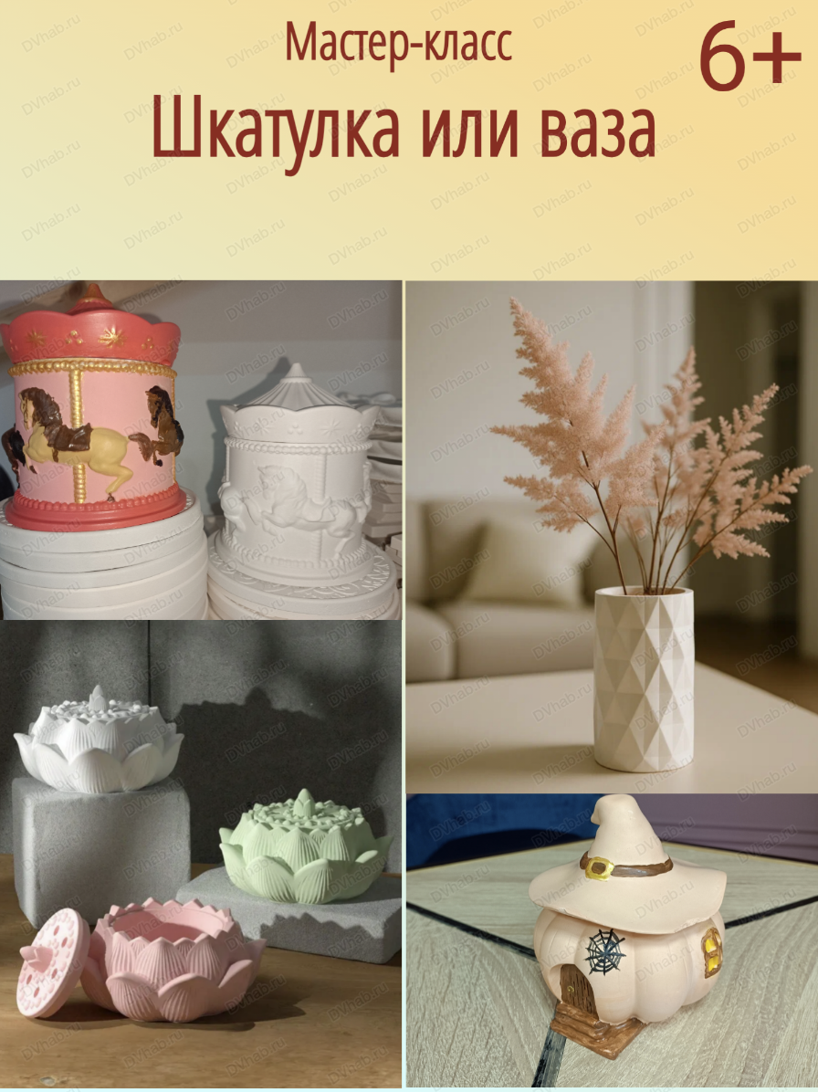 Мастер-класс – это прекрасный способ провести время с семьей или друзьями, получить новые навыки и знания, а также создать уникальные подарки для близких. Вам будут предложены заготовки на выбор и широкий ассортимент силиконовых форм - ваза под стеклянную колбу в форме: сердца, овала, прямоугольника, кота; ваза для сухоцветов - цилиндрической формы с ромбами, морская тематика. Готовые гипсовые изделия станут отличным украшением интерьера, добавив в него тепло и уют.