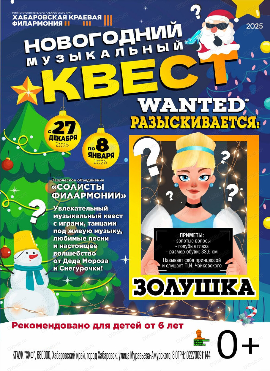 Вместе с персонажами любимой истории вы отправитесь прямиком в сказку и станете ее участниками, выберете Золушке подходящий наряд, поможете справиться со всеми поручениями злобной мачехи, станцуете на Новогоднем королевском балу, где обязательно повстречаете Деда Мороза и Снегурочку… А декорацией к интерактивному спектаклю станет весь концертный зал Хабаровской филармонии!