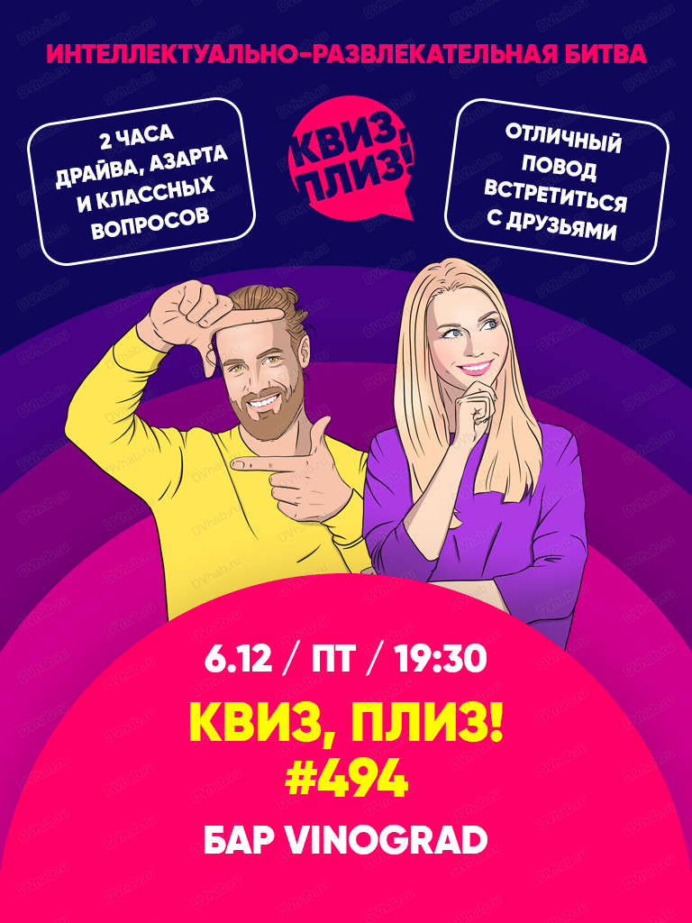 Квиз, плиз! - это командная игра, победить в которой помогут эрудиция, логика, сообразительность и вообще любые знания, которые когда-либо встречались вам в жизни. Отличный повод провести вечер с друзьями, размять мозги и получить новые позитивные впечатления. Собирайте команду от 2 до 9 человек и  регистрируйтесь.