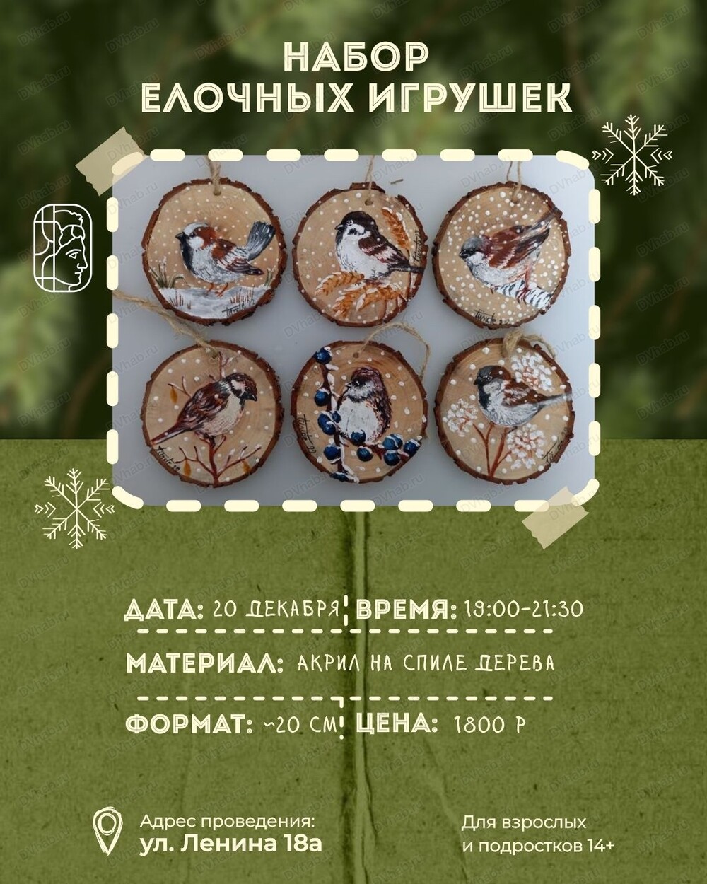 На мастер-классе вы сделаете рисунок акрилом на спиле дерева. Формат каждой игрушки 20 см. Для взрослых и подростков от 14 лет.
