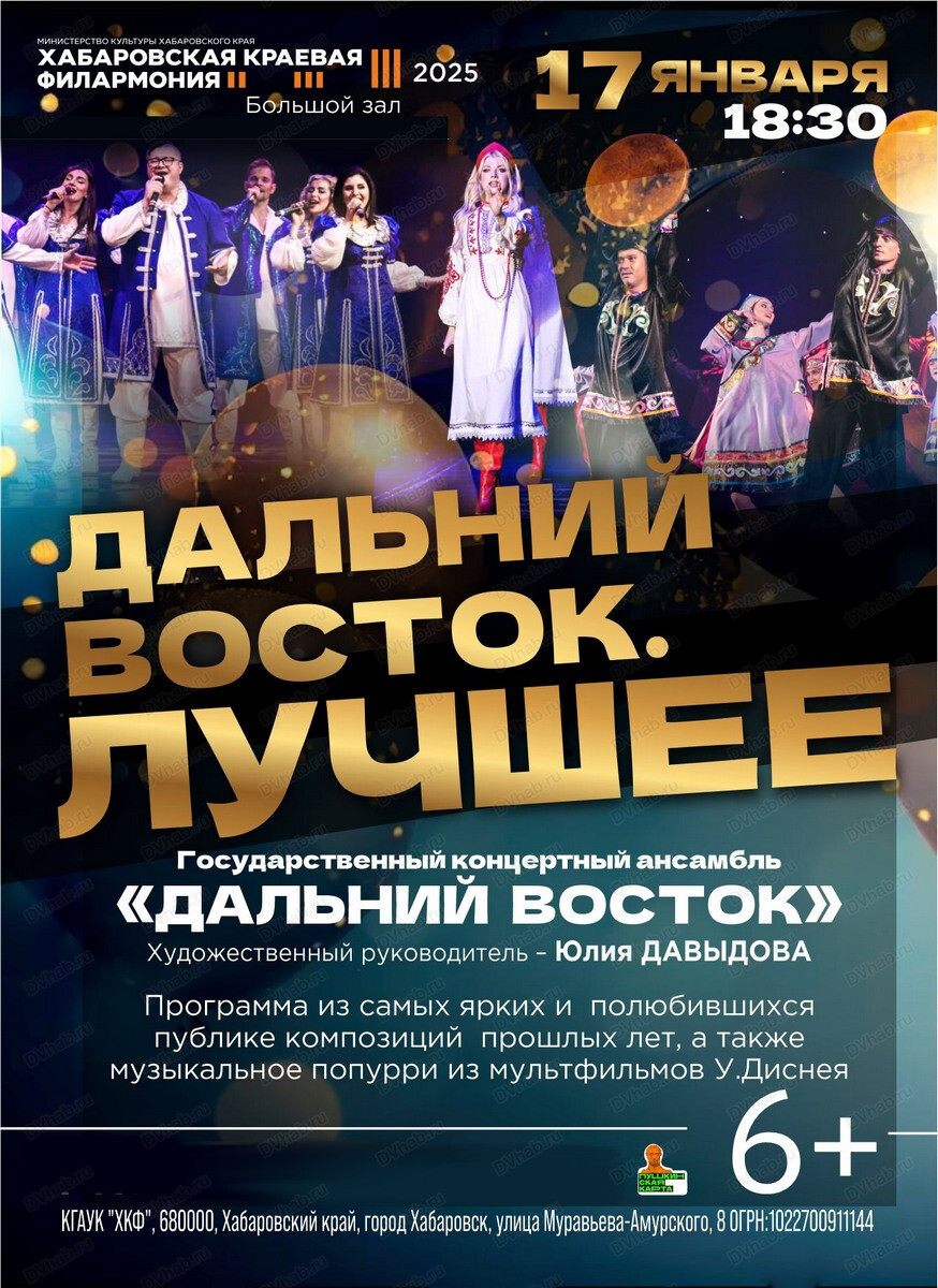 Вот уже на протяжении 45 лет государственный концертный ансамбль «Дальний Восток» радует нас своим творчеством. Сегодня ансамбль снова приглашает Вас на очередную программу, где будут представлены самые запоминающиеся номера прошлых лет.