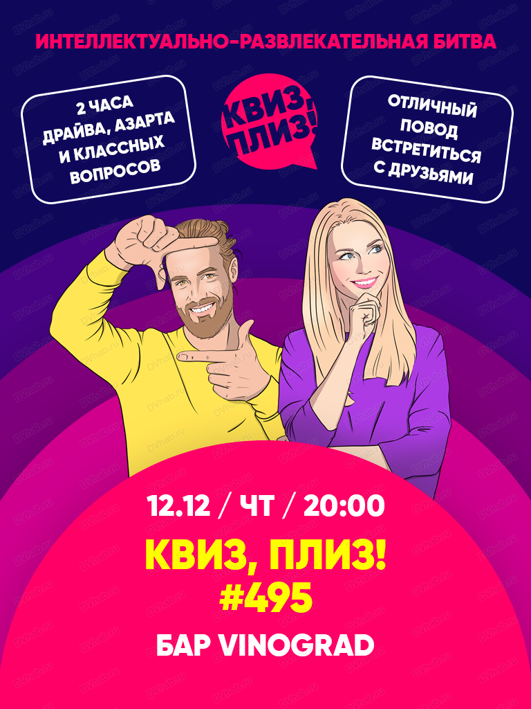 Квиз, плиз! - это командная игра, победить в которой помогут эрудиция, логика, сообразительность и вообще любые знания, которые когда-либо встречались вам в жизни. Отличный повод провести вечер с друзьями, размять мозги и получить новые позитивные впечатления. Собирайте команду от 2 до 9 человек и регистрируйтесь.