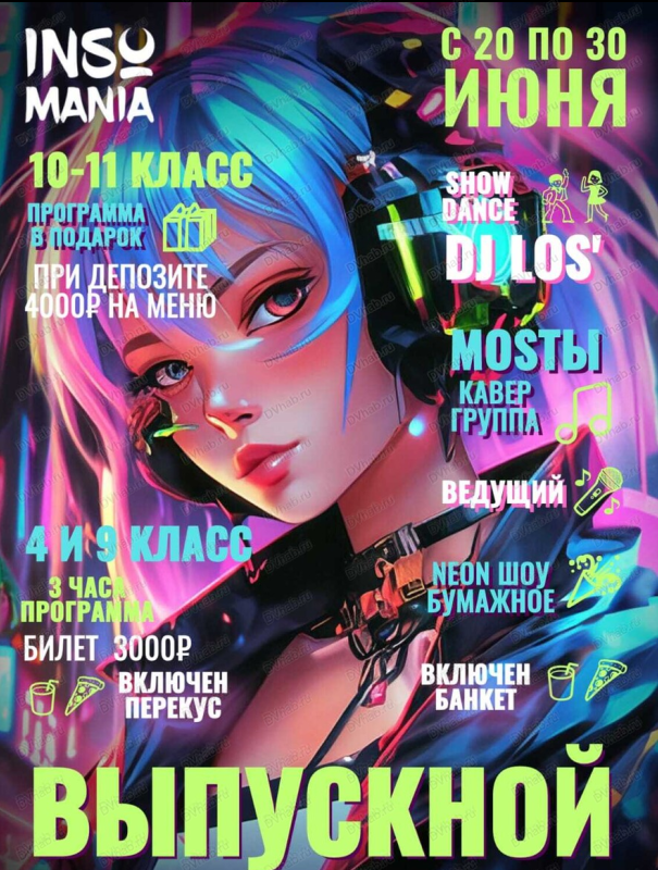 Выпускные для школьников в ночном клубе "Инсомания" в свете неона и прожекторов.