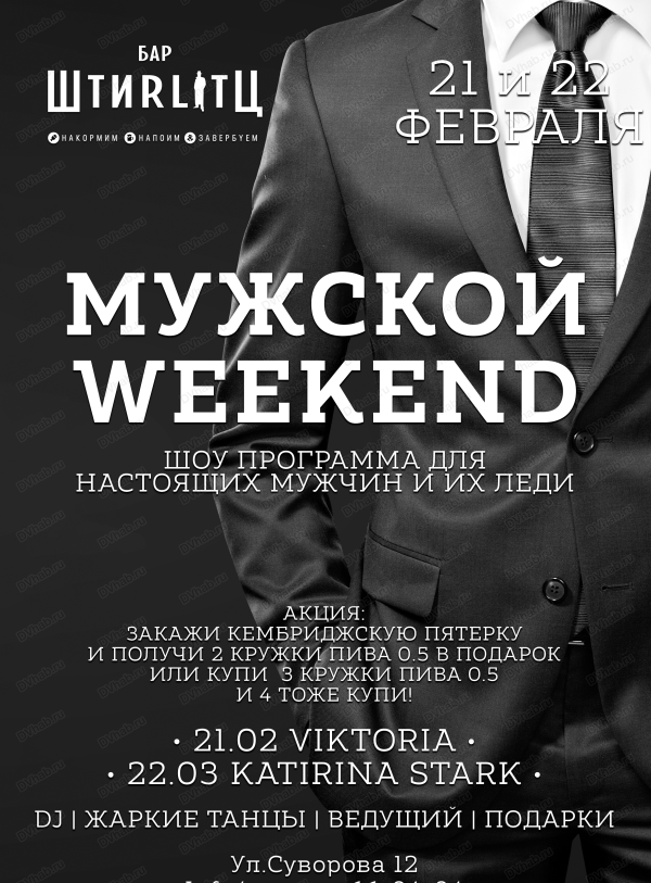 21 и 22 февраля бар "Штирлиц" отмечает "Мужской weekend", посвященный Дню защитника Отечества.