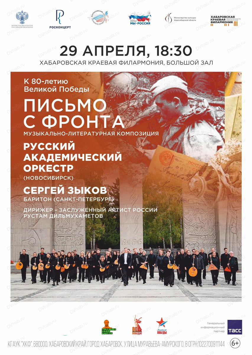 «Письмо с фронта» – музыкальная программа Русского академического оркестра под управлением Рустама Дильмухаметова, посвященная 80-летию Великой Победы. Вместе с оркестром в этот вечер на сцену выйдет Сергей Зыков. Прозвучат как популярные и любимые многими поколениями песни: «Смуглянка», «Случайный вальс», «Темная ночь», «Журавли», «Поклонимся великим тем годам», так и малоизвестные, почти забытые, песни о войне.