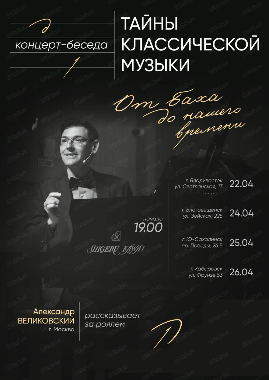 Музыковед и пианист Александр Великовский приглашает вас окунуться в увлекательный мир классической музыки, по-новому взглянуть на музыкальные шедевры и погрузиться в тайны, содержащиеся в них.
