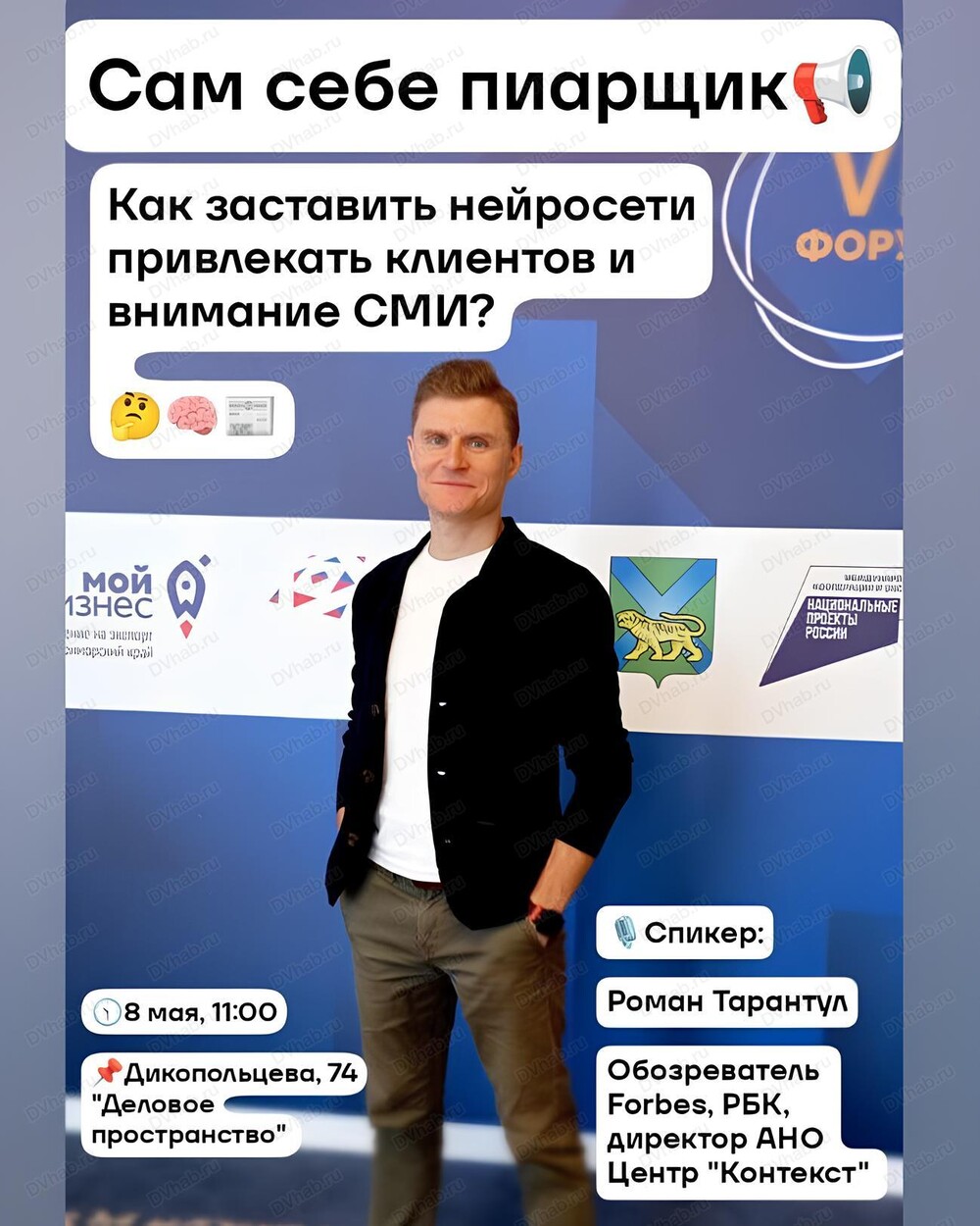 8 мая в уютном коворкинге "Деловое пространство" пройдёт практический воркшоп "Сам себе пиарщик! Как заставить нейросети привлекать клиентов и внимание СМИ?".