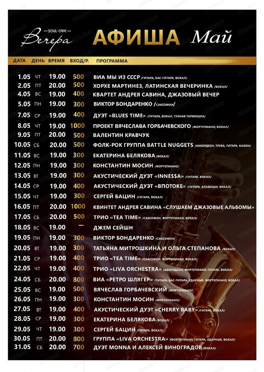 Вас приглашают на ужин под звуки саксофона, фортепиано и прекрасного вокала в исполнении трио Tea Time. Любовь Назарова исполнит всем вам знакомые композиции, а виртуозная игра Алишера на саксофоне и Александра на фортепиано не оставит равнодушным ни одного гостя.
