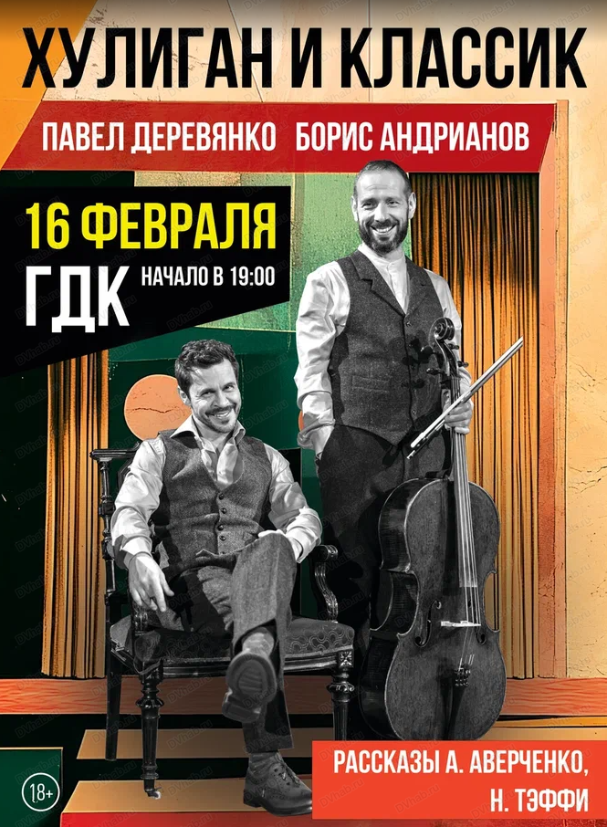16 февраля в ГДК пройдет литературно-музыкальная программа "Хулиган и классик" с участием виолончелиста Бориса Андрианова и актера Павла Деревянко.