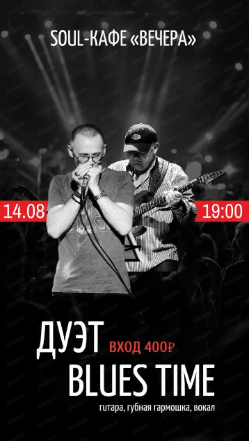 14 августа в соул-кафе "Вечера" выступит дуэт "Blues time" (гитара, вокал, губная гармошка).