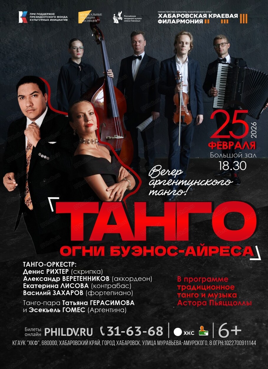 Вечер аргентинского танго с Танго-оркестром Александра Веретенникова и танцорами Татьяной Герасимовой и Эсекьелем Гомесом из Аргентины. Молодой коллектив, созданный по подобию аргентинских коллективов, исполняющих музыку танго. В составе ансамбля молодые музыканты, лауреаты международных конкурсов Александр Веретенников (аккордеон), Денис Рихтер (скрипка), Василий Захаров (фортепиано), Екатерина Лисова (контрабас). Событие вечера – маэстро из Буэнос-Айреса Эсекьель Гомес в паре с Татьяной Герасимовой.