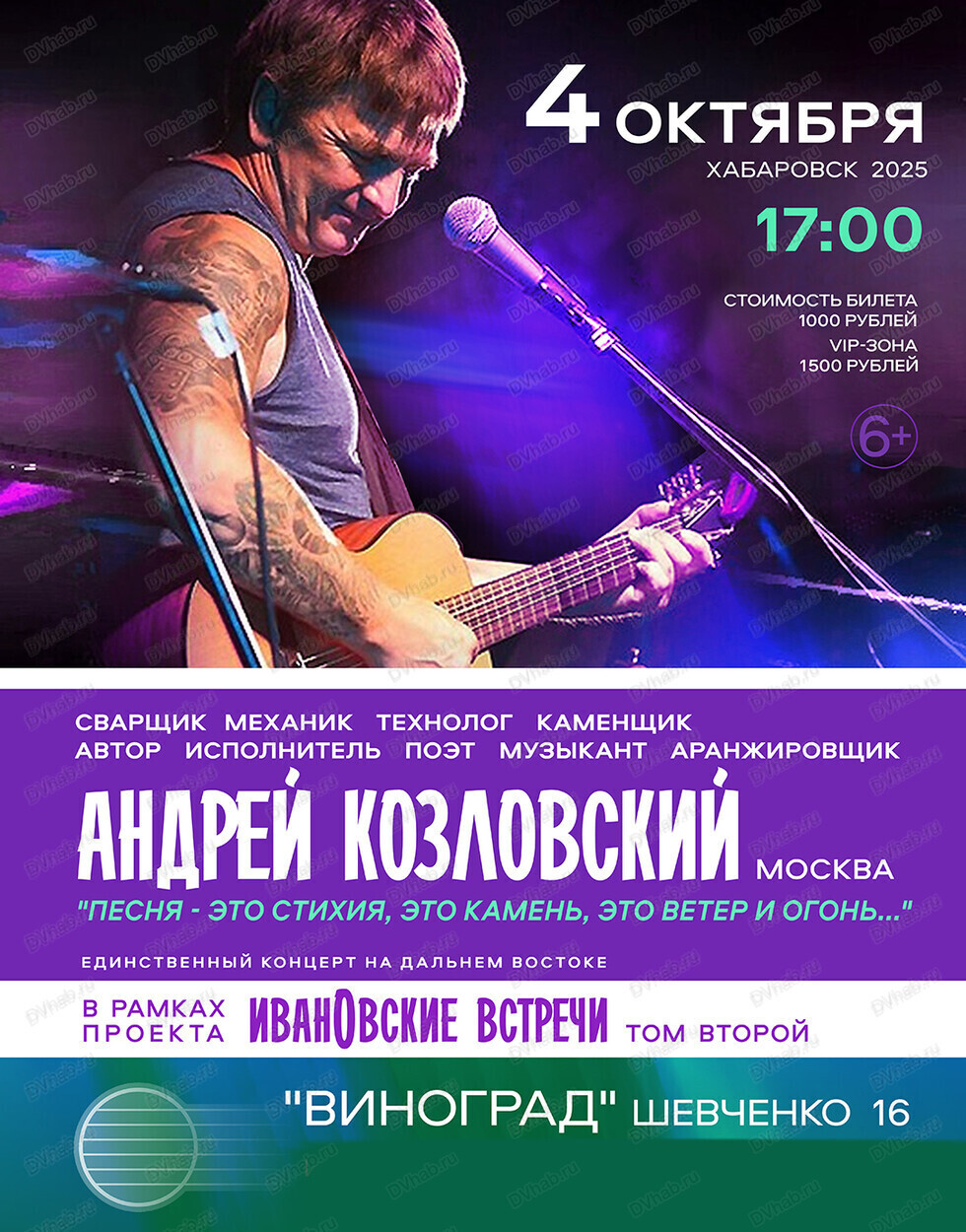 Вас приглашают на единственнный на Дальнем Востоке концерт Андрея Козловского, драйвового музыканта, сильного поэта, крутого аранжировщика, философа-каменщика.