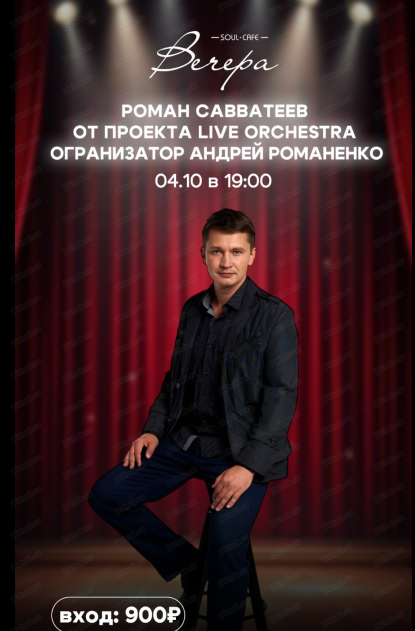 Вас ждет выступление Романа Савватеева от проекта Live Orchestra, организатор Андрей Романенко.