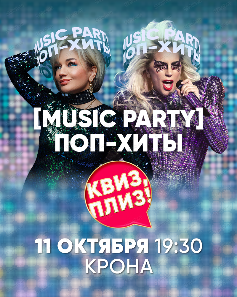 Квиз, плиз! [music party] поп-хиты — тусич в мире Квиз, плиз! Конечно, и здесь найдётся, где блестнуть своей эрудицией, но самая сложная задача — не начать танцевать посреди вопроса. [music party] объединяет людей. Вместе со своими друзьями вы слушаете хиты разных лет, коллективно их отгадываете и веселитесь весь вечер!