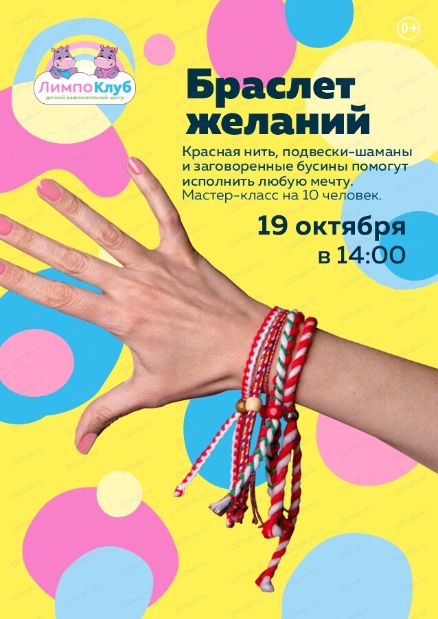 19 октября детский развлекательный центр "ЛимпоКлуб" приглашает на мастер-класс "Браслет желаний".