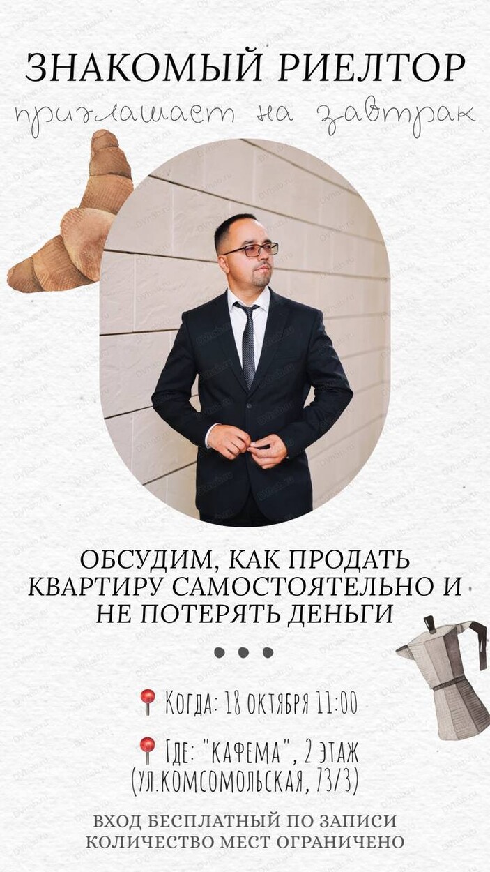 Хотите продать квартиру самостоятельно, но не знаете с чего начать? Вас приглашают на бесплатный завтрак с риелтором Дмитрием Алексеевым, владельцем агентства недвижимости «Знакомый риелтор», где вы получите практические знания для успешной продажи вашей недвижимости.