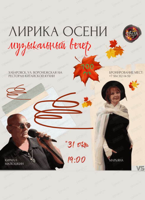 Вас ждет музыкальный вечер "Лирика осени", песни об осени, о душе, о любви.