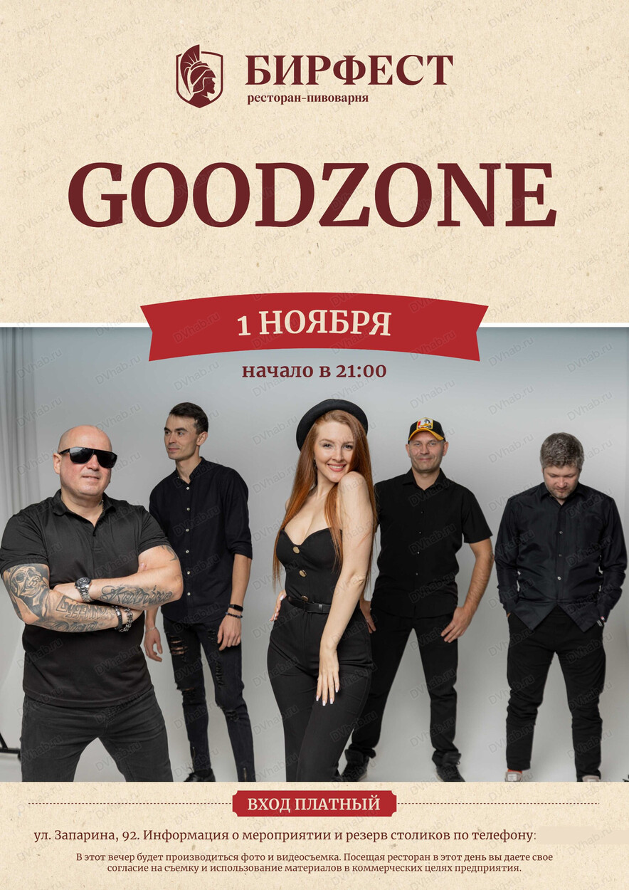В BeerFest продолжаются традиционные субботние концерты. 1 ноября (суббота) на сцене — крутейшая группа Goodzone. Всех любителей отличной музыки и драйва ждут в 21:00. Готовьте свои голосовые связки и заряд позитива — будет жарко.