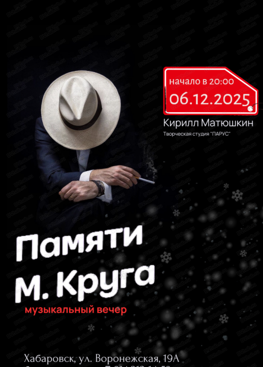 Вас приглашают на музыкальный вечер, посвященный памяти Михаила Круга. Для вас поет К. Матюшкин. В программе песни из репертуара легендарного шансонье М. Круга. Вспомним, попоем. Приходите!
