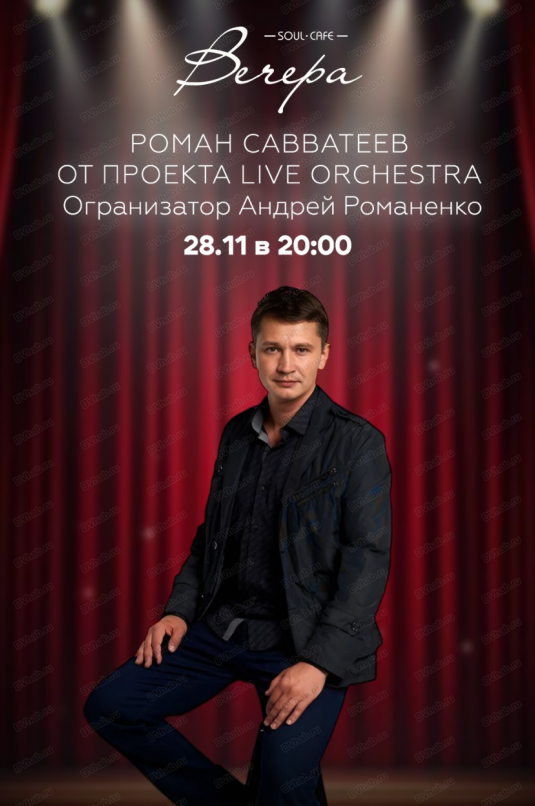 Вас ждет выступление Романа Савватеева от проекта Live Orchestra, организатор Андрей Романенко.