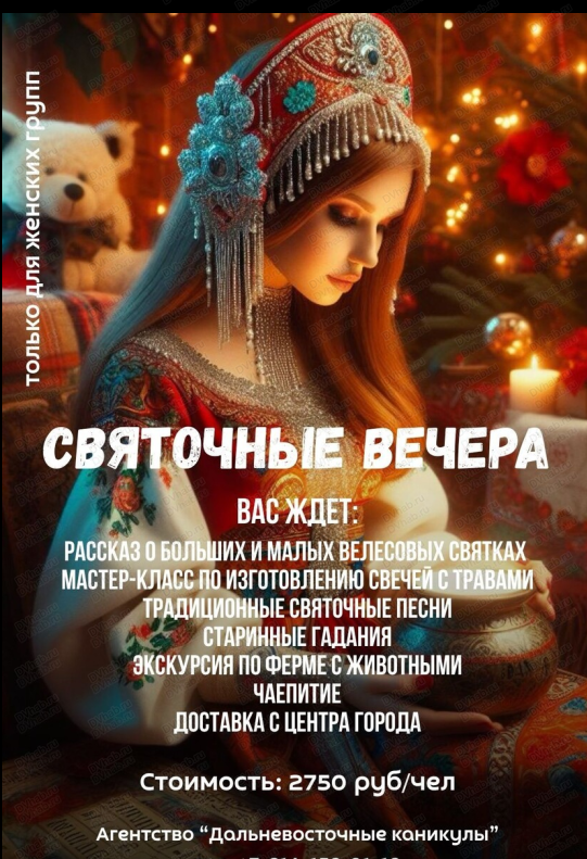 Вас ждёт: травяные чаи, угощения , мастер-класс по свечам, песни, гадания. От вас - красивые, русские наряды или любой атрибут для особой атмосферы.