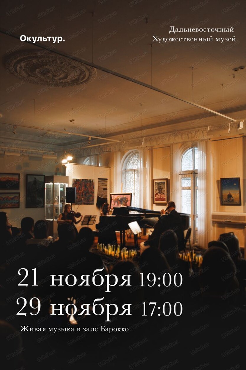 Уникальное слияние живой музыки (камерное трио) и шедевров изобразительного искусства (коллекция Дальневосточного художественного музея).