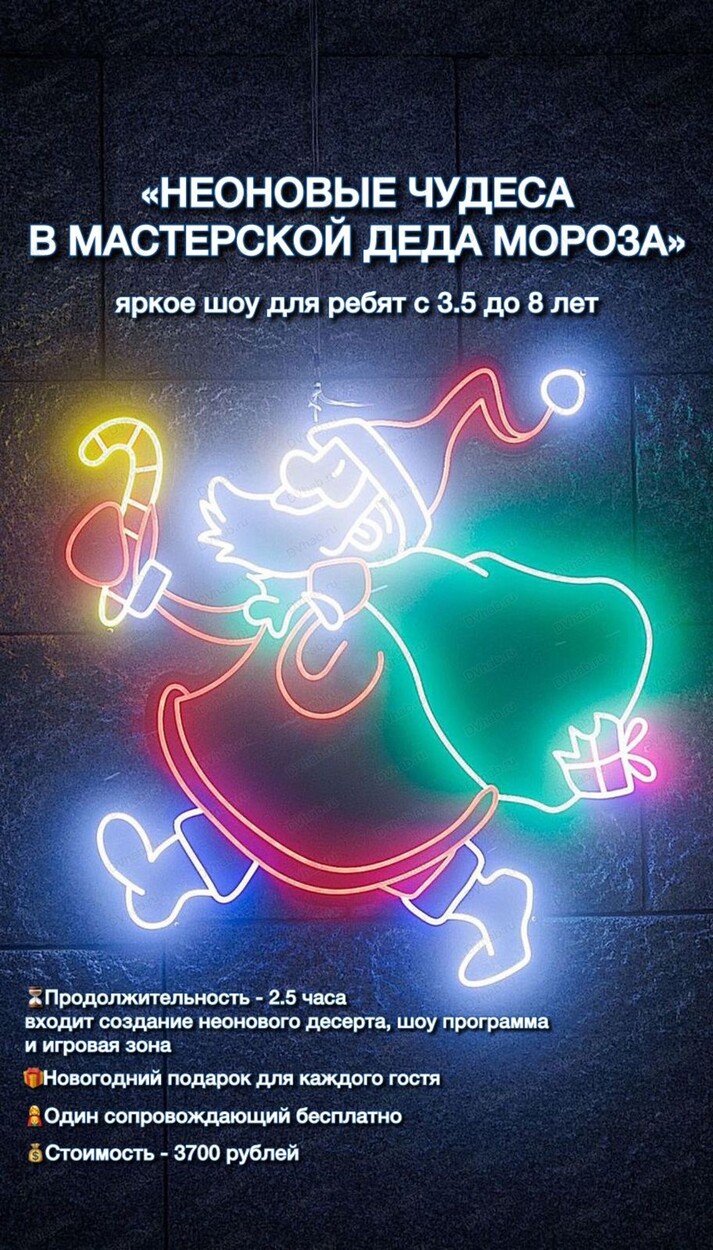 Здесь каждая минута наполнена добром, удивлением и радостью открытия! Вас ждут весёлые игры, сказочные конкурсы и долгожданная встреча с Дедушкой Морозом и Снегурочкой. А в подарок каждый малыш унесёт с собой частичку неоновой сказки и сюрприз от самого главного зимнего волшебника.