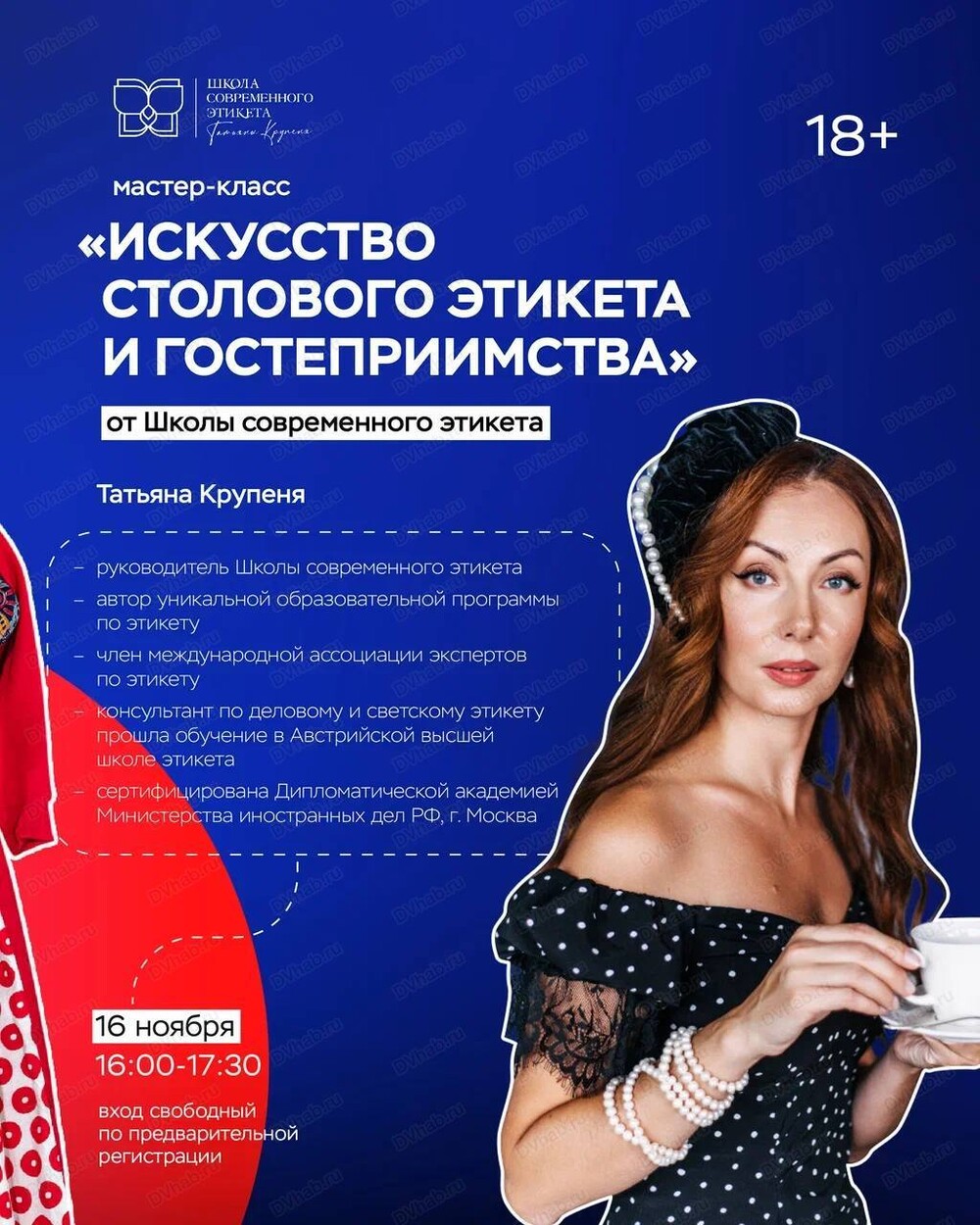 Мастер-класс проведети руководитель Школы современного этикета Татьяны Крупеня, автор уникальной образовательной программы по этикету, консультант по деловому и светскому этиткету, прошла обучегние в Австрийской высшей школе этикета.