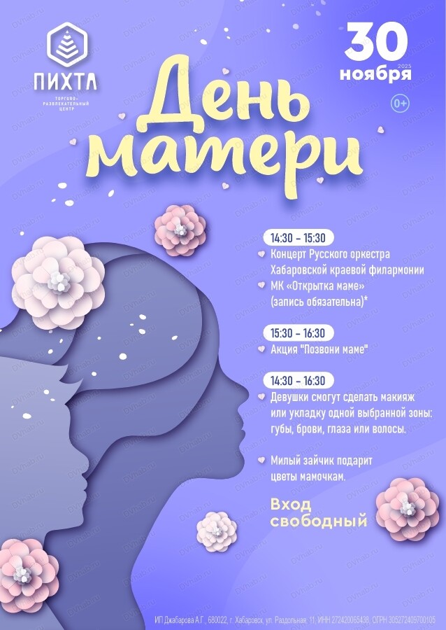 Вы зарегистрированы на событие «День матери в ТРЦ "Пихта"», на 30 ноября 14:30