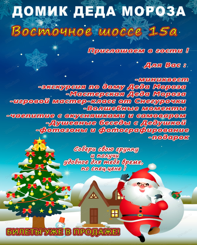 Вас приглашают в гости к Дедушке Морозу. Домик Деда Мороза - это место, где живет Дед мороз. Расположен он вдалеке от городского шума и суеты по адресу Восточное шоссе, 15А.