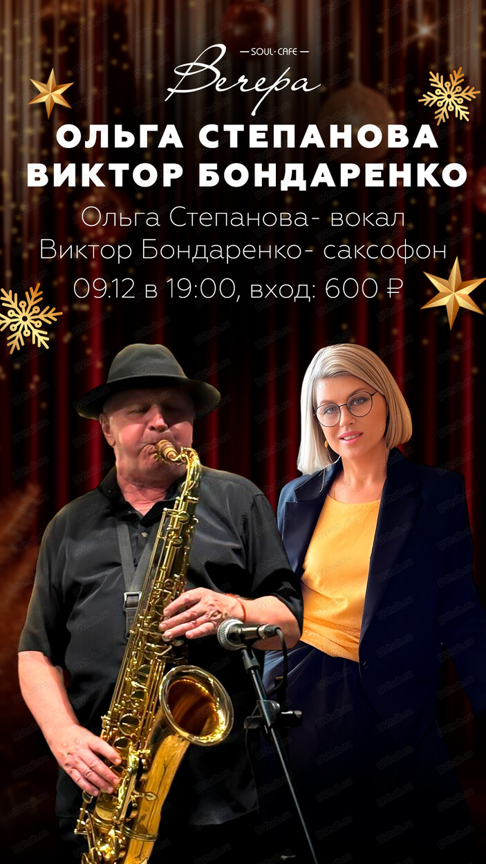 Вас ждет вокальный вечер в исполнении Ольги Степановой и саксофон от Виктора Бондаренко..