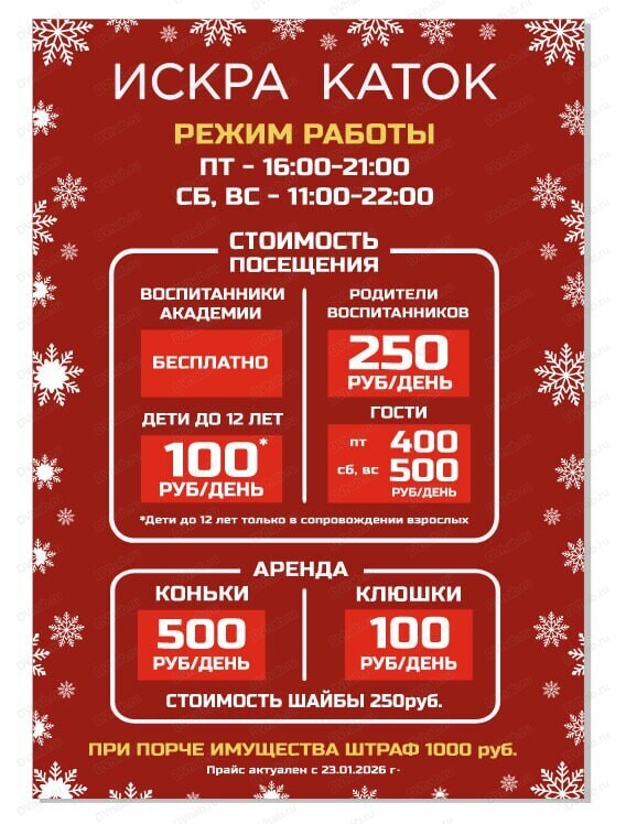 Стоимость: пт. 400 руб., сб-вс- 500 руб. Для воспитанников академии "Искра" бесплатно, для родителей воспитанников 250 руб. Для детей до 12 лет - 100 руб./день. Прокат коньков 500 руб./день