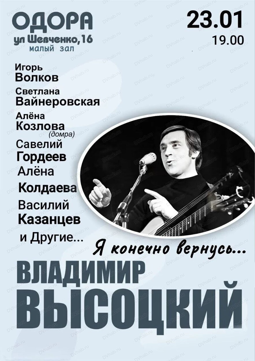 23 января в Доме офицеров в малом зале в 19.00 для всех любителей творчества знаменитого поэта, барда и актера Владимира Высоцкого пройдет концерт "Я конечно вернусь..". Будут исполнены песни и стихотворения автора. Для вас выступят авторы-исполнители города Хабаровска и молодые таланты исполнят песни артиста в разных музыкальных аранжировках. Большинство песен прозвучат под гитару.