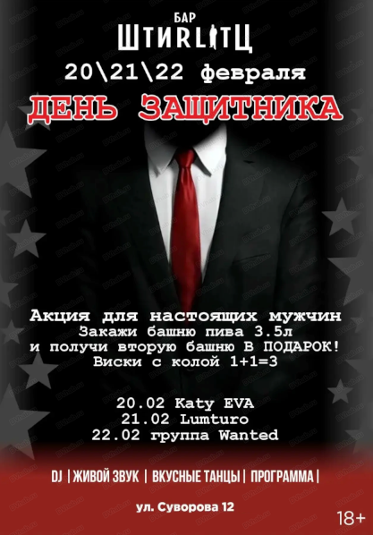 20, 21, 22 февраля в баре "Штирлиц" пройдет вечеринка "День защитника".