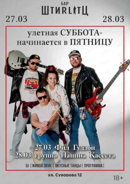 27 марта для вас выступит "Фил Гудзон". 28 марта приходите послушать группу "Папина кассета".