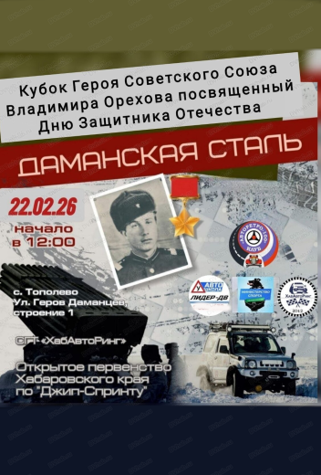 22 февраля в 12.00 на спортивно-гоночной трассе "ХабАвтоРинг" состоится открытое первенство Хабаровского края на кубок Героя СССР Владимира Орехова по джип-спринту "Даманская сталь", традиционные соревнования, посвященные Дню Защитника Отечества.