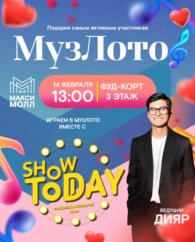 14 февраля зовите своих половинок и любимых друзей поиграть в "МузЛото" с Showtoday, спеть любимые песни, потанцевать и выиграть подарки от магазинов "Макси Молл".