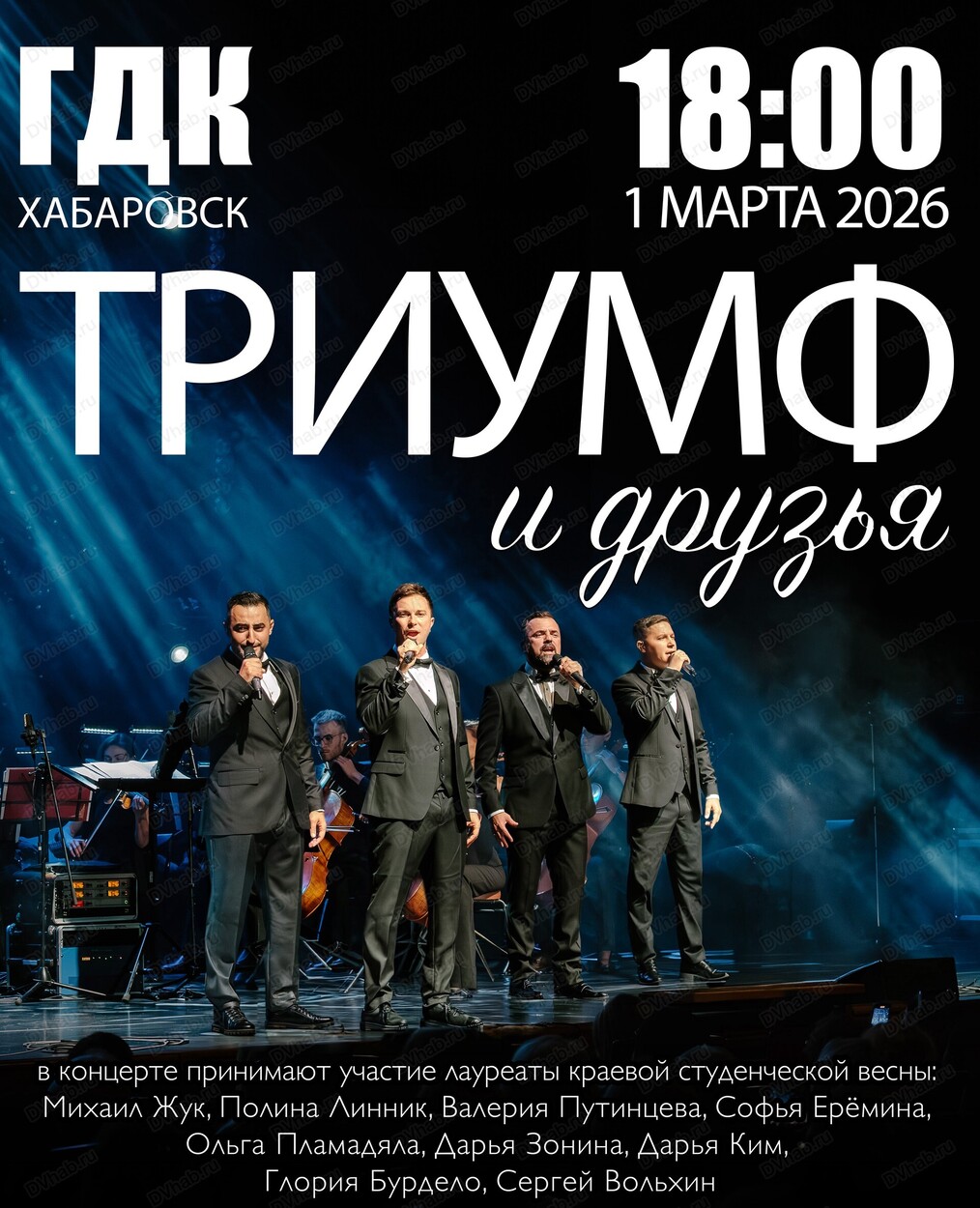 Мужской квартет "Триумф" - профессиональный вокальный коллектив, который привлекает разновозрастную аудиторию и воспитывает музыкальную культуру зрителя с 2014 года. В составе: Александр Пугаков (тенор, солист Государственного концертного ансамбля "Дальний Восток"), Тарон Григорян (баритон, популярный артист-дальневосточник), Сергей Уваров (тенор, солист фронтовой творческой бригады Ансамбля песни и пляски ВВО) и художественный руководитель коллектива – Владимир Бабенко (баритон, резидент арт-кластера "Таврида").