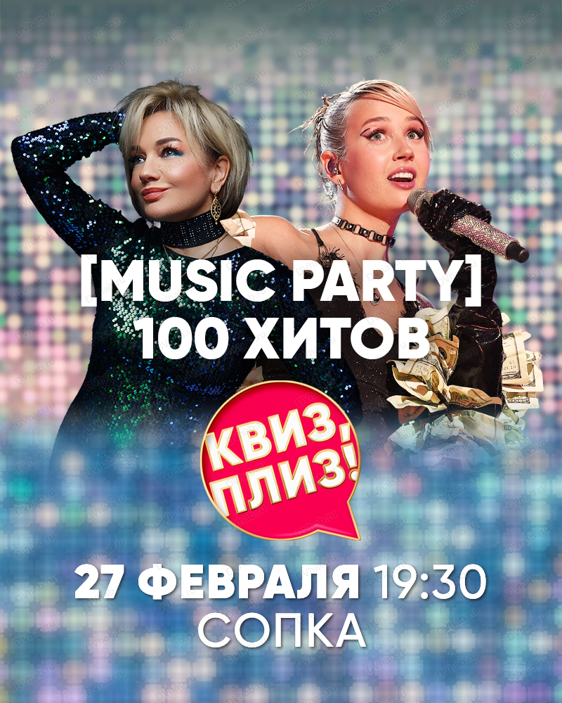 [music party] 100 хитов — тусич в мире "Квиз, плиз!". Конечно, и здесь найдётся, где блестнуть своей эрудицией, но самая сложная задача — не начать танцевать посреди вопроса. Вместе со своими друзьями вы слушаете классные треки, коллективно их отгадываете и веселитесь весь вечер!