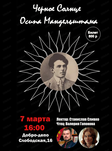 Мероприятие "Чёрное солнце"— это не просто вечер памяти, это возможность прикоснуться к живому слову, почувствовать его силу и актуальность в современном мире. Приходите, чтобы вместе с нами открыть новые грани гения Мандельштама и ощутить его «чёрное солнце», которое светит и сегодня всех ценителям поэзии.