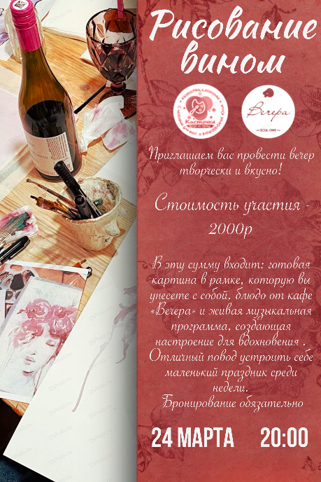 24 марта в кафе "Вечера" пройдет творческий вечер "Рисование вином".
